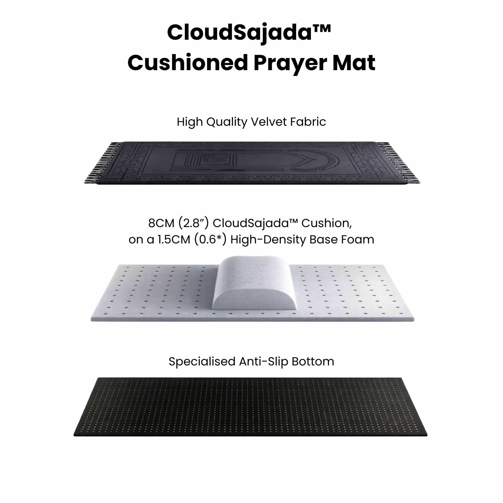 CloudSajada™ is designed to deliver superior comfort and support, helping reduce pressure on hard surfaces so you can stay focused, present, and at ease throughout your prayer.